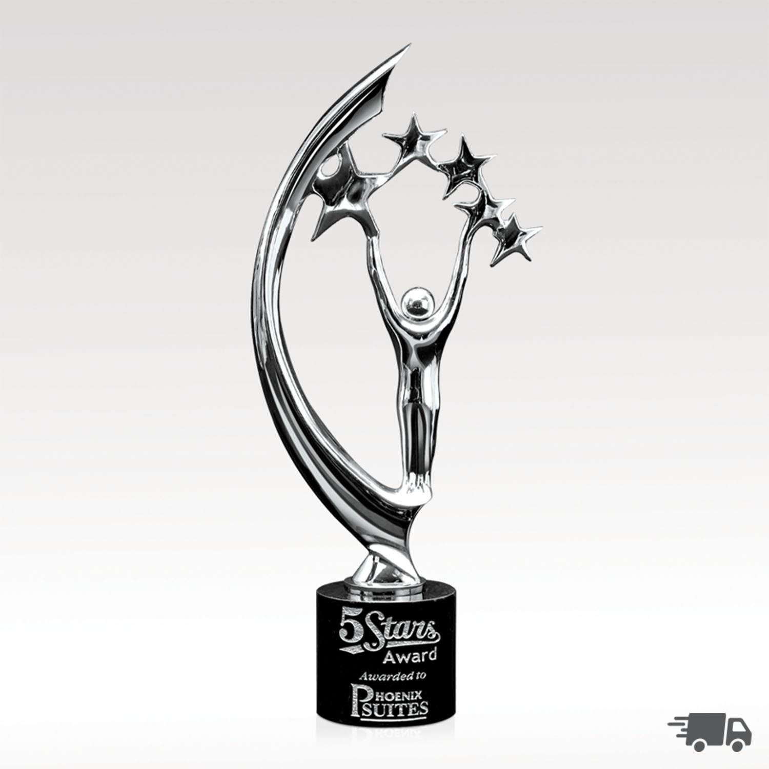 The 3.25" x 14" Custom Top Star II Award captures the essence of achievement with a chrome-finished cast metal figure triumphantly lifting a string of stars, all rising from a sleek black marble base. A red carpet–worthy design, it’s a bold celebration of excellence and ambition. Wit a dimension of 3.25" W x 14.00" H x 3.25" D.
