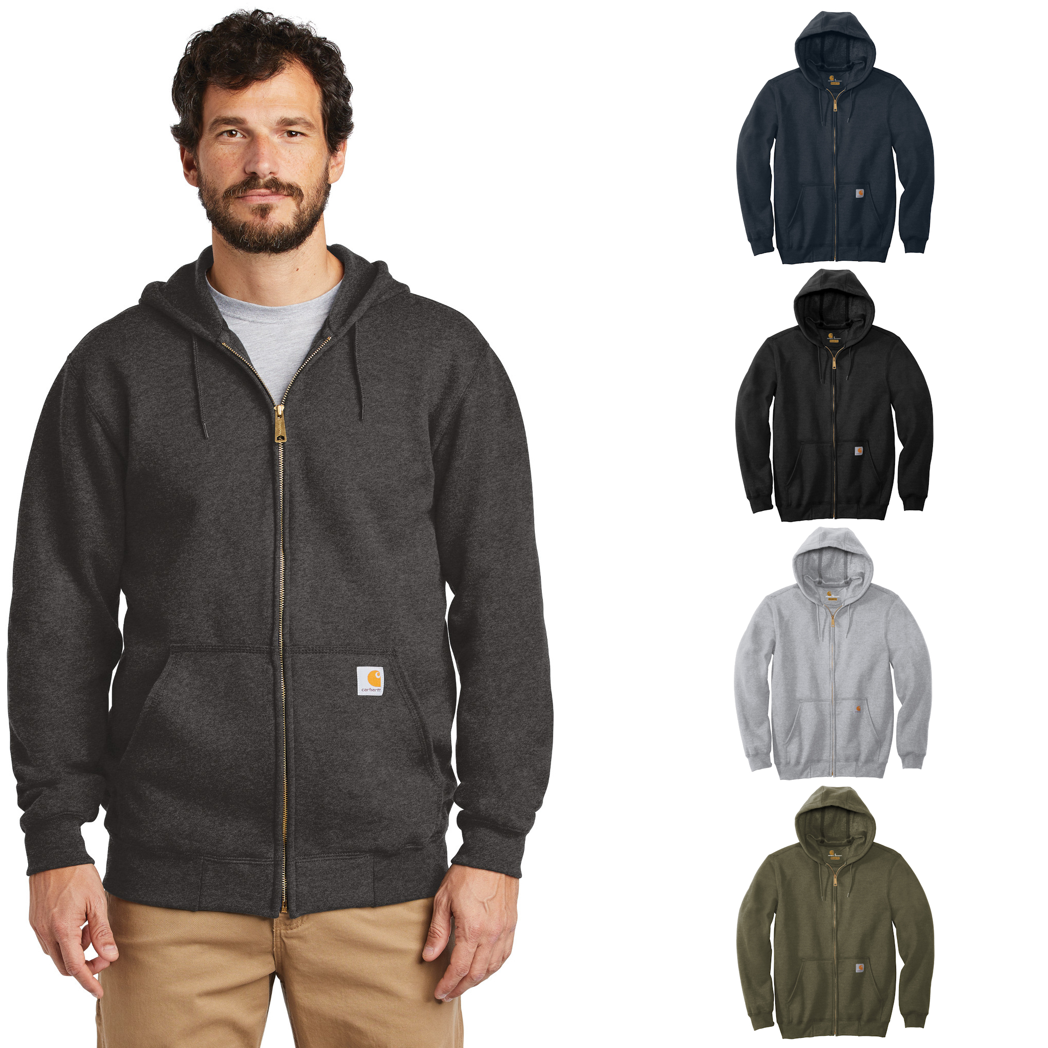 Carhartt’s Midweight Hooded Zip-Front Sweatshirt brings considerable comfort to cool-weather worksites and now with your logo embroidered or screen printed. Made of 10.5-ounce, 50/50 cotton/poly blend or a 70/30 cotton/poly blend (Heather Grey). Attached three-piece hood with drawcord closure and full-length brass front zipper. Two front hand warmer pockets with stretchable, spandex-reinforced, rib knit cuffs and waistband.