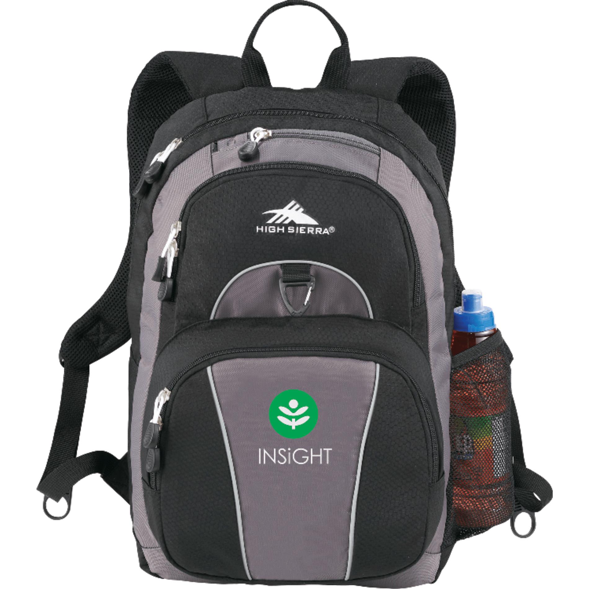 With more zippers than you can count, this backpack is excellent for keeping you organized. The High Sierra® Enzo Backpack is a multi-compartment backpack that features two large main compartments and an organizer compartment with pen pockets and ranks as one of our favorite backpacks! Top zippered accessory pocket are also offered with a headphone port. Large gusseted side mesh beverage pocket. Comfort is provided by S-shaped padded shoulder straps, a padded back panel and a heavy duty webbing grab handle. Signature High Sierra hardware. Includes lifetime warranty! Contact LogoBoss for more high quality custom branded bags and apparel!