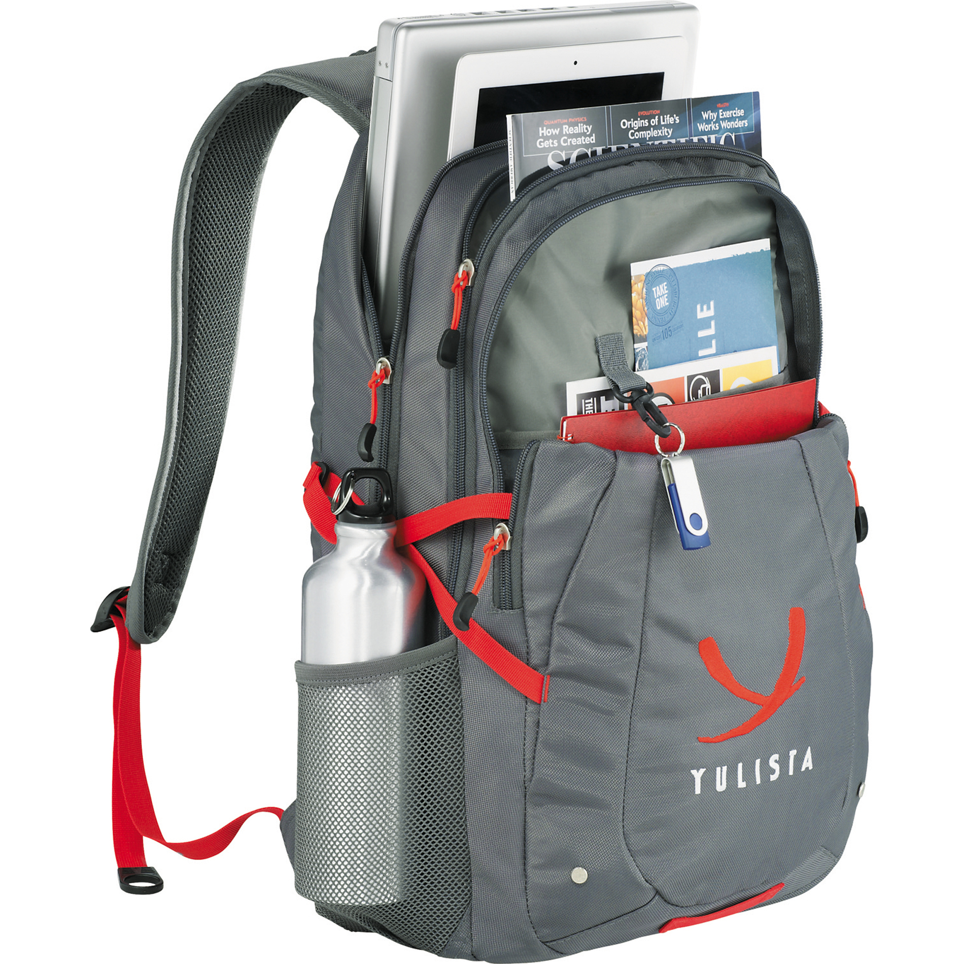 Need a high quality custom branded backpack that will be used for many years? The High Sierra® Fallout with your custom logo features a large multi-compartment design and fully padded Cushion Zone™ computer sleeve that fits most 17" laptops. Integrated Tech Spot™ sleeve fits most tablets, including iPads. Core organizer with multiple pockets and key fob. Mesh beverage pocket. S-shaped, yolk style padded Vapel™ mesh shoulder straps with media pocket. Primary padded back panel. Adjustable side compression straps. Convenient grab handle. Front panel webbing loop for attaching extra gear. Contact LogoBoss for more custom branded bags and apparel!