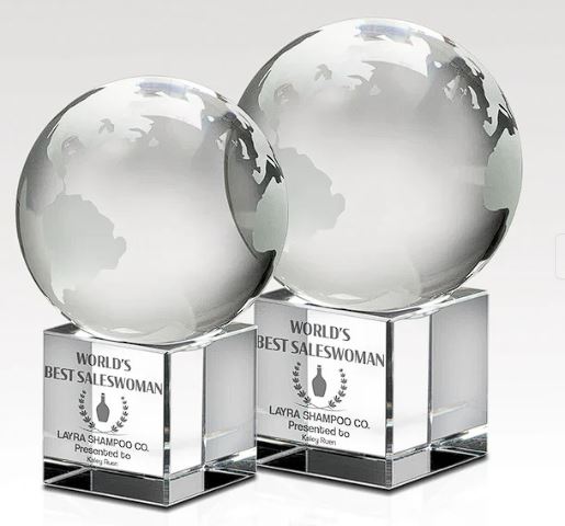 Introducing the "Custom Etched Crystal Award" — a stunning symbol of global excellence. Crafted from premium optical crystal, this radiant globe features intricately etched world graphics that reflect both elegance and ambition. It sits on a solid square base, offering plenty of space to add your personalized message. Available in two sizes — 2.375" W x 3.50" H x 2.375" D (small) and 3.125" W x 4.625" H x 3.125" D (large) — this award is a perfect way to celebrate achievements that make a worldwide impact.
