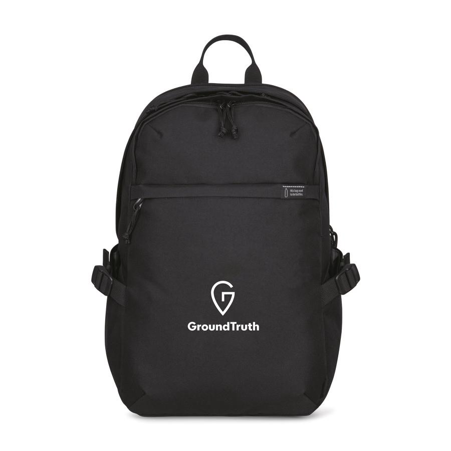 Our Custom Imprinted Laptop Backpack is a modern and sustainable update to a classic computer backpack using recycled fabric and webbing made from plastic bottles. Top dual zippered pocket for storing accessories. Front zippered pocket with key fob clip. Dual side water bottle pockets with compression straps. Rear padded, dual zippered laptop compartment which holds up to a 15" laptop. Contact LogoBoss for more custom branded products!