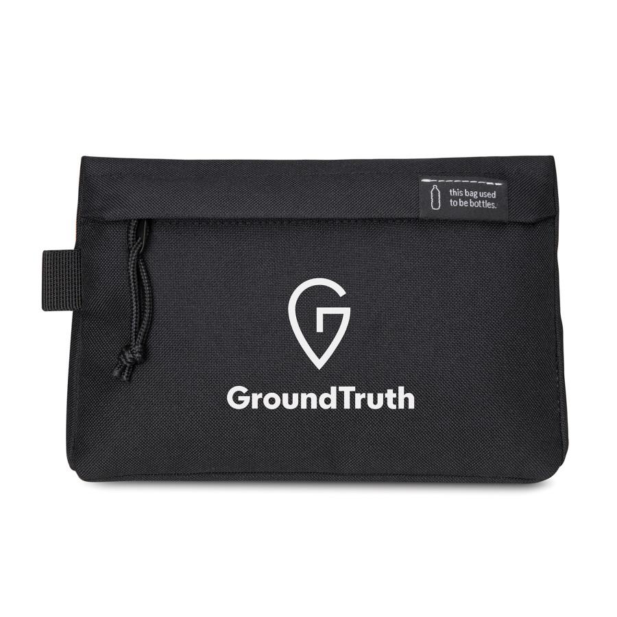 A modern custom pouch made from water bottles! This is a sustainable update to a classic pouch using recycled fabric and webbing made from plastic bottles. Keep accessories organized while on-the-go. Webbing loop detail for attaching a carabiner or keychain. Zippered closure to main compartment. Includes the tag "This Bag Used to be Bottles" - a fun way to show you care about our planet and recycling. Contact LogoBoss for more eco-friendly and sustainable products with your custom logo!