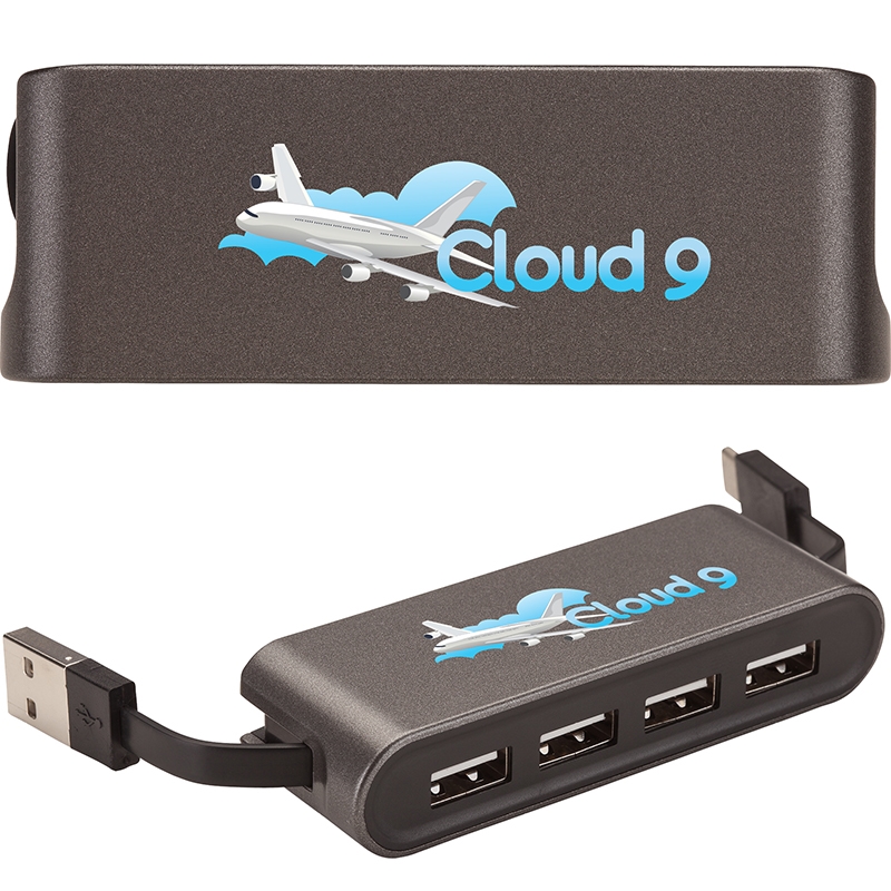 Need a giveaway idea for the tech-oriented clients in your sphere? This versatile and stylish four-port 2.0v USB hub has two cables to connect or charge your standard Type A devices to a traditional Type A port or a newer Type C port. The compact design with stow-away connector cables makes it great for travel and as a corporate gift. Contact LogoBoss for more custom branded products!