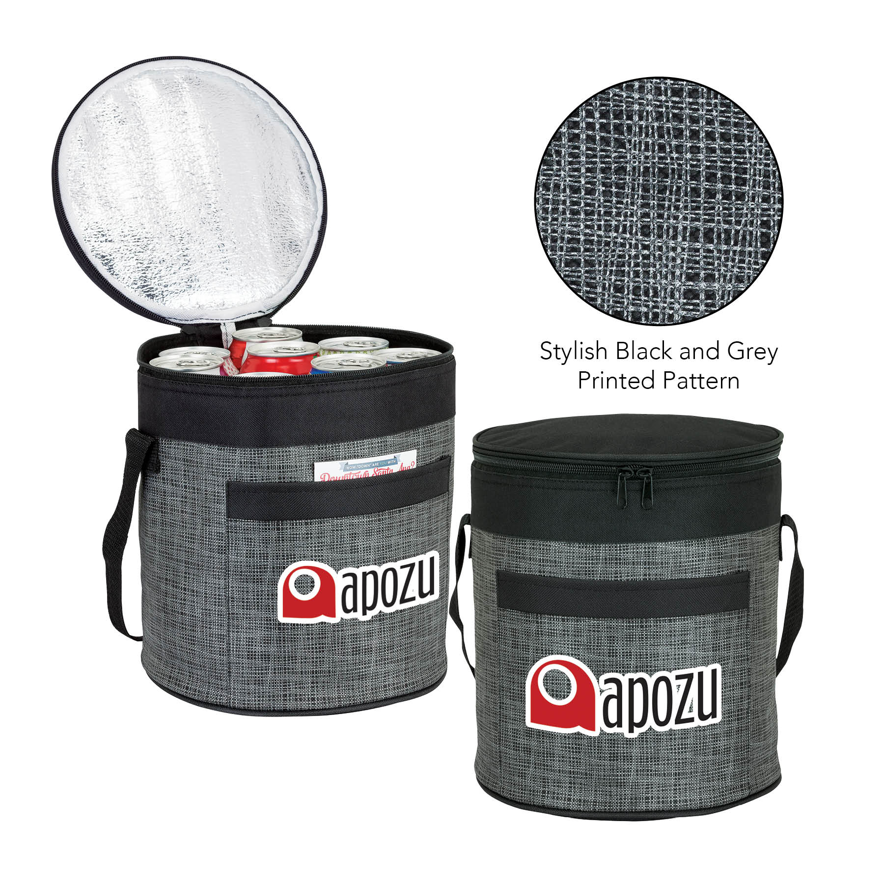 Our custom branded Barrel Cooler with your logo is just the thing you need to keep your drinks icy cold while attending that next sporting event or socially distanced get-together with the neighbors in style! Made from 80 gsm non-woven polypropylene and featuring a 14-can zippered foil-lined main cooler compartment, you'll also find an exterior pocket perfect for holding napkins and other items like your mobile phone. Holds drinks and snacks, keeping them nice and chilled. The black and gray exterior print is the perfect backdrop for your logo. Folds flat for easy storage. We love the shape of this round promotional cooler, a great corporate gift for your next picnic or outing!