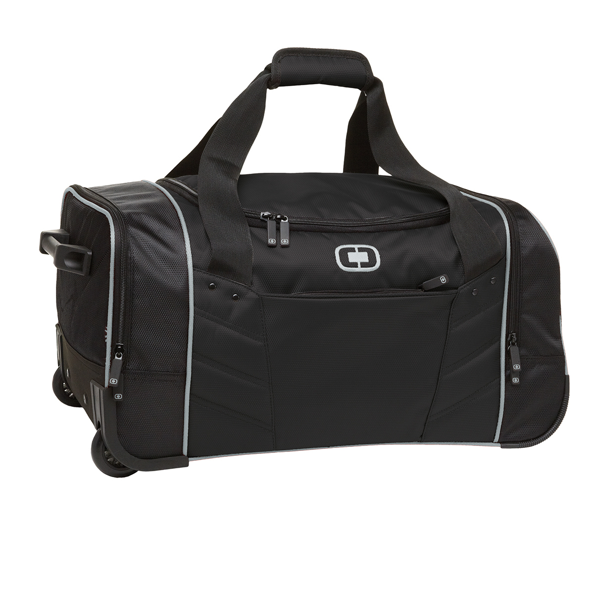 Skate effortlessly through the airport or train station with this durable wheeled duffel that's sized to fit your trip. Use it in place of traditional luggage. Made with durable 420D poly canvas. Locking retractable handle for optimum mobility. Large center storage area for clothes, toiletries and other travel accessories and hidden front exterior zippered stash pocket. Side exterior zippered pockets for extra storage. Wrapped handle for comfortable carrying. Strong, durable grip handle on foot, soft grip handles on top for easy lifting. With its in-line skate wheels, this travel piece has the roominess of a duffel with the mobility of a wheeled suitcase. Dimensions: 22"h x 13"w x 12.5"d, capacity: 3,668 cu. in./60L, Weight: 6.4 lbs./2.9kg. A great name brand rolling duffel bag. Price includes 1-color, 1-location imprint.