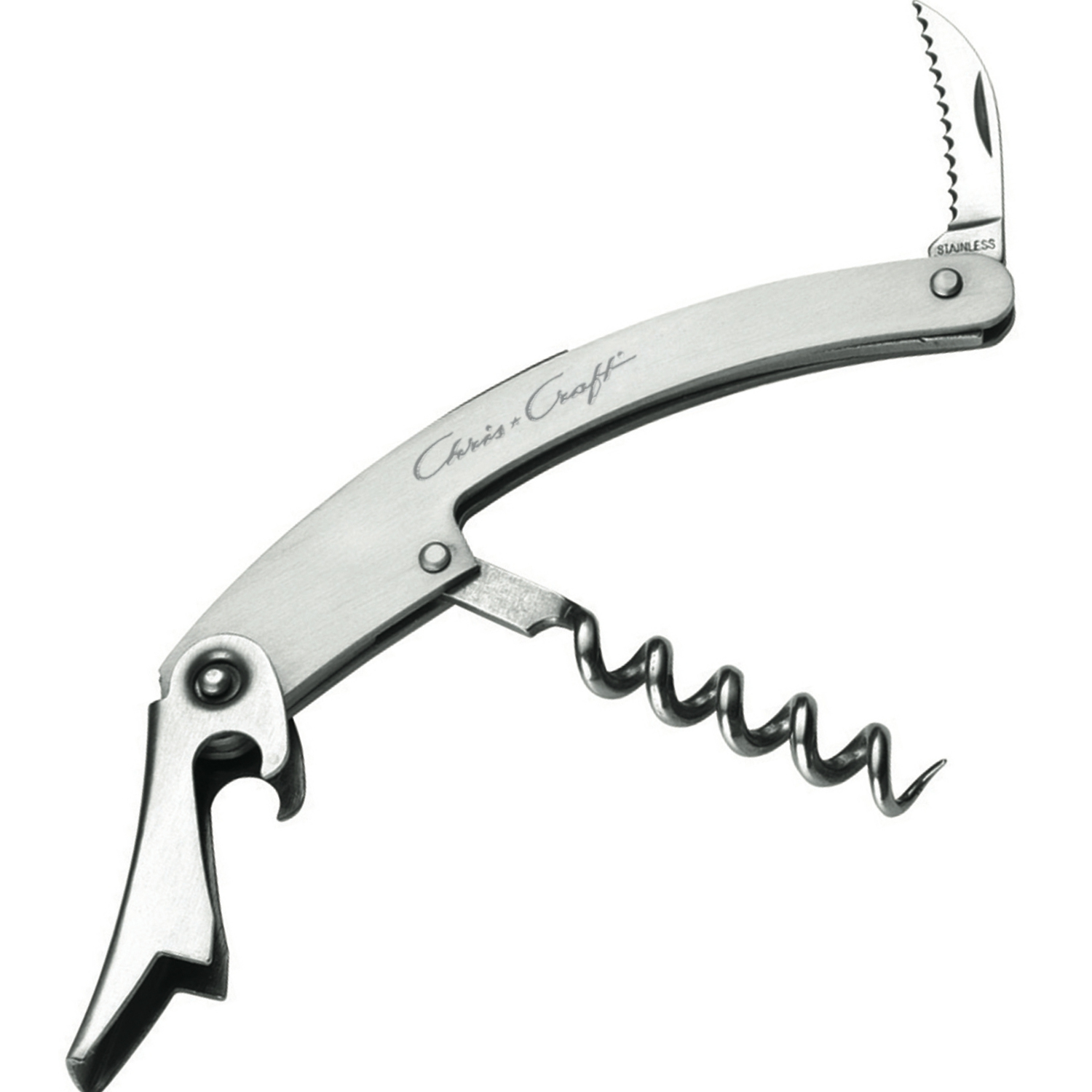 This is a classic-- one of the best wine openers on the market. Stainless steel construction with a corkscrew, serrated edged knife for removing foil and lever and bottle opener. All laser engraved with your logo! Handy pocket size.