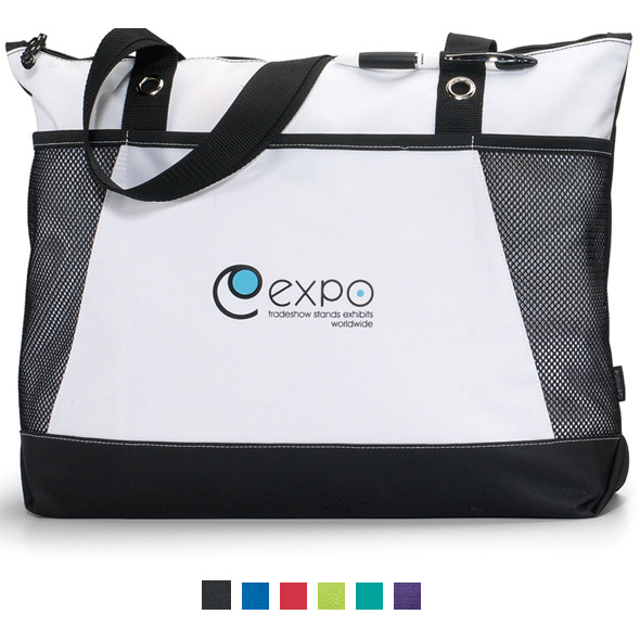 The Venture Business Tote Bag by Logoboss. Great for trade shows. Tote your brand with style! Zippered main compartment provides ample storage. Front pocket with Velcro closure. Pen loop (pen not included). Mesh pockets for water bottles (water bottle not included) and other easy to reach items. 28.5" shoulder straps and grommet details. Back panel of each bag matches primary bag color. This is one of our staff favorites in tote bags! Price includes 1-Color, 1-Position imprint. Full Color imprint available! RUSH PRODUCTION AVAILABLE!